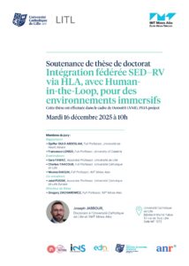 Nous félicitions Joseph Jabbour pour la soutenance de sa thèse le 16 décembre 2025, intitulée : « Intégration fédérée SED-RV via HLA, avec Human-in-the-Loop, pour des environnements immersifs ».